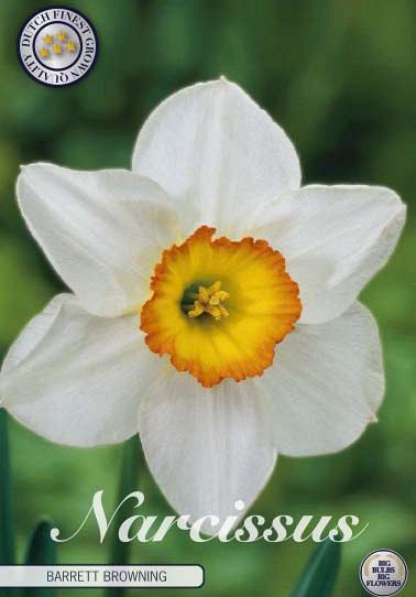 | Extra omschrijving | Introducing Narcissus Large Cupped 'Barrett Browning,' a captivating addition to your garden. Featuring white flowers with an orange-scarlet cup, this variety brings a striking contrast of colors to your landscape. Plant between April and May for blooms from September to January. Each package includes 5 premium bulbs, sized 14/16 cm. Thriving in half sun to half shade, 'Barrett Browning' reaches heights of 50 cm with a planting depth of 7.5 cm. Enhance your garden with the enchanting beauty of 'Barrett Browning' as it blooms with elegance and charm, infusing your outdoor space with its captivating presence. |